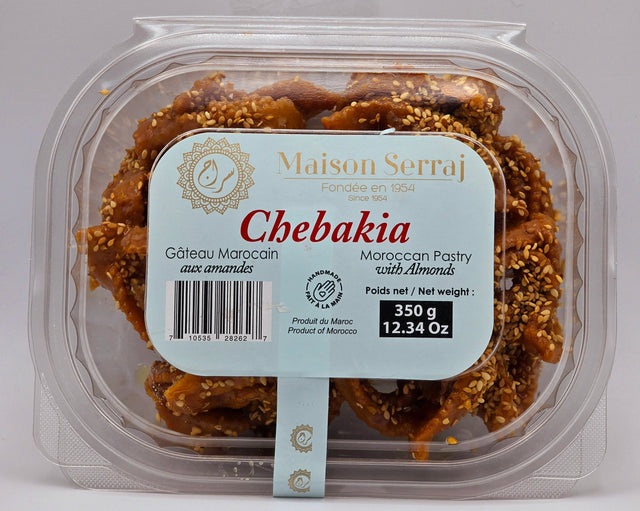 La Chebakia artisanale de la Maison Serraj (350 g) est une pâtisserie marocaine traditionnelle, à base d'amandes, épicée à l'anis, à la cannelle et au safran, frite, puis trempée dans du sirop de miel et garnie de graines de sésame. Une friandise sucrée et florale, parfaite pour les occasions festives comme le Ramadan.